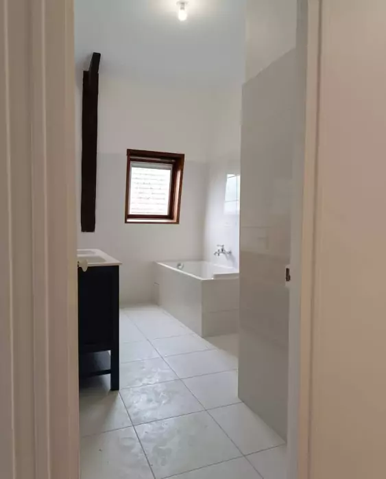 Le point clé de ce projet : la création complète d’une salle de bain à l’étage, impliquant la mise en œuvre d’un système d’évacuation spécifique. Ce type d’intervention requiert une coordination précise entre plusieurs corps de métier, que nous avons assurée grâce à notre équipe polyvalente.
